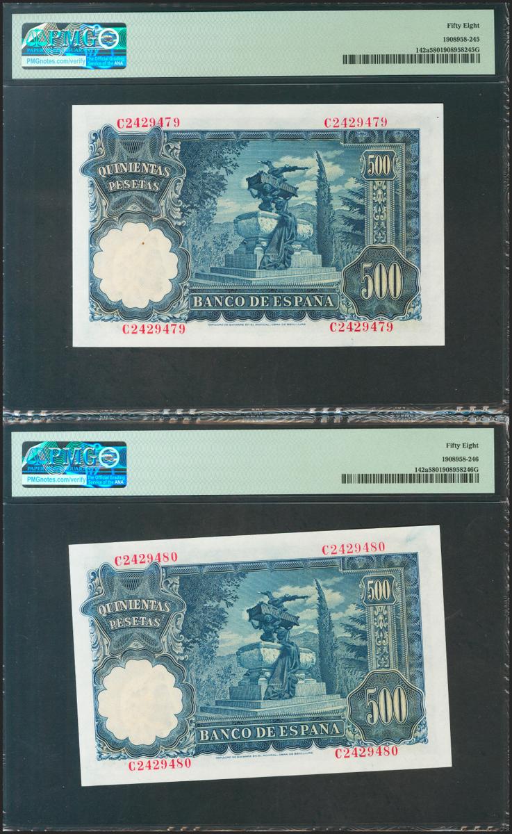 500 pesetas. November 15, 1951. Correlative couple. Series C, last series issued. (Edifil 2021: 460a, Pick: 142a). Unusual in this quality. EBC ++. PMG58 package, both.