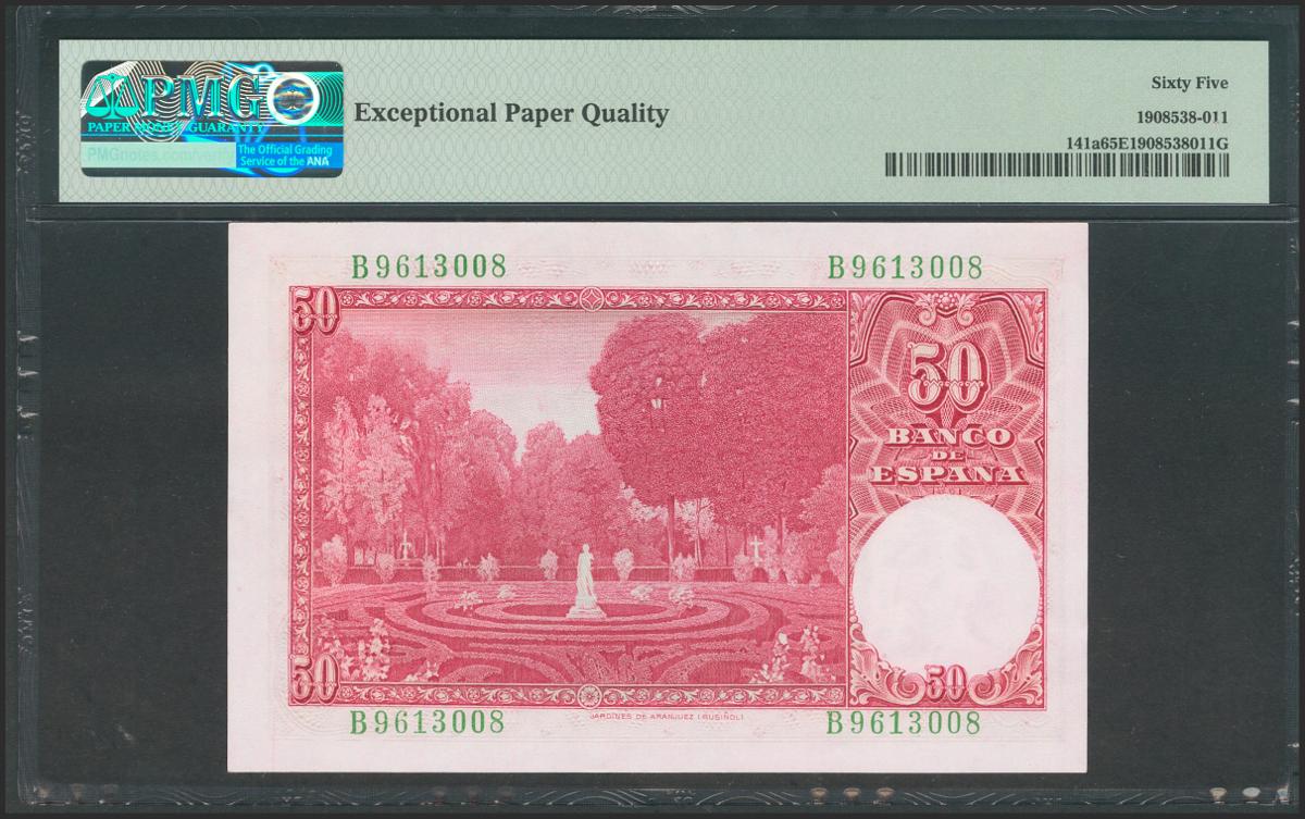 50 Pesetas. December 31, 1951. Series B. (Edifil 2017: 462a). Unusual like this, it retains all its original sizing. Uncirculated. Packaged PMG65EPQ.