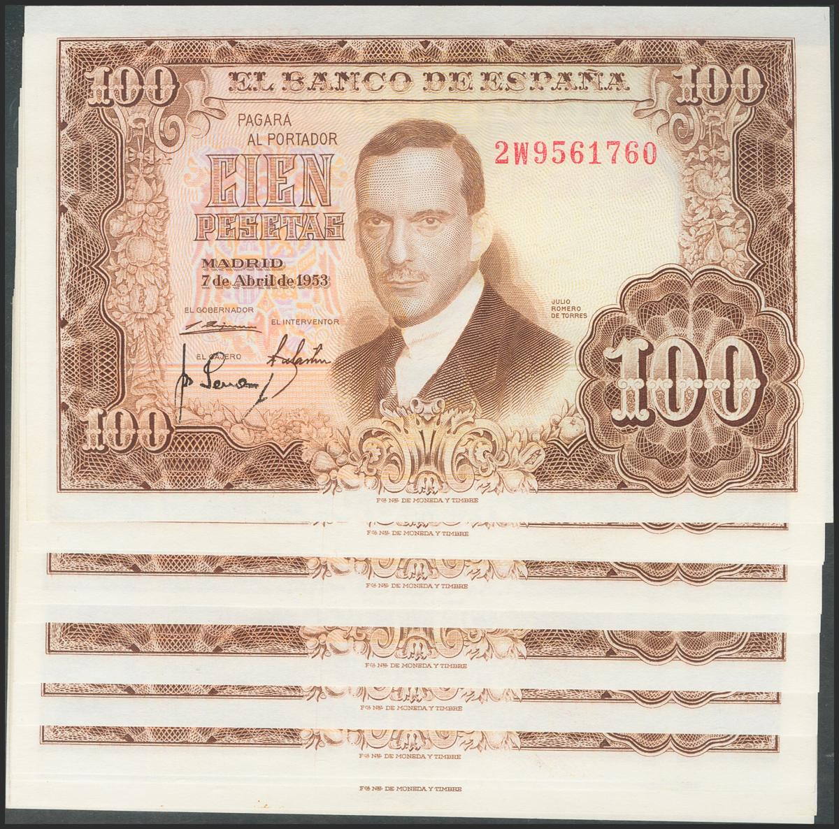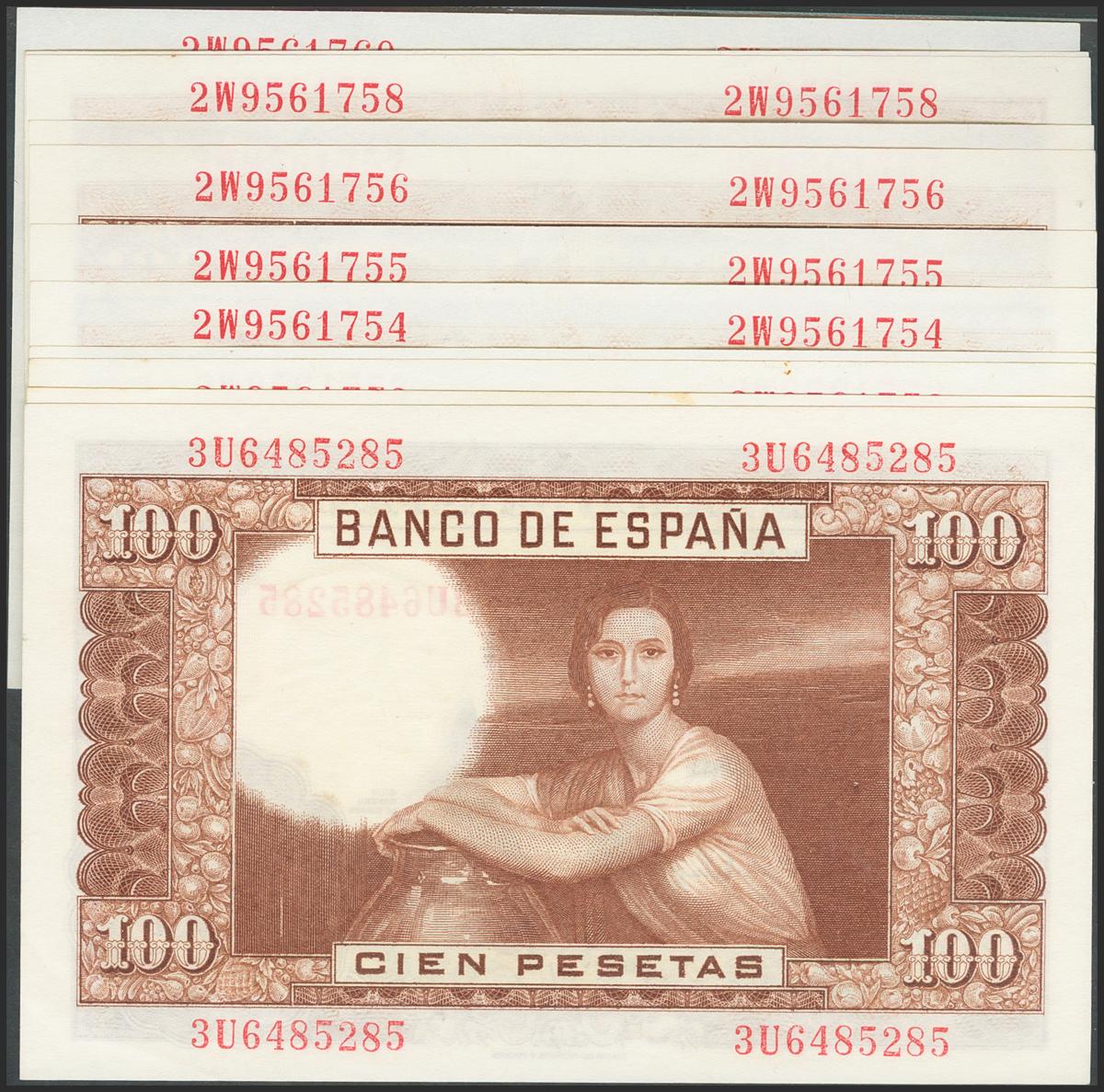 English Set of 13 banknotes (many of them correlative) of 100 Pesetas issued on April 7, 1953, with the series 2W (9), 3Q (2), 3U (2) (Edifil 2017: 464c). Uncirculated/ Almost Uncirculated.