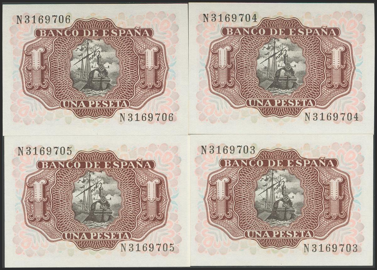 Set of 4 correlative banknotes of 1 Peseta issued on July 22, 1953 and with the series N. (Edifil 2021: 465a), preserving the original size. Uncirculated.