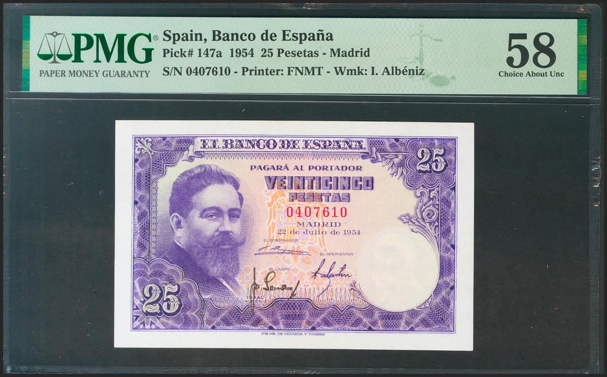 25 Pesetas. July 22, 1953. Without series. (Edifil 2021: 467, Pick: 147a). EBC ++. PMG58 package.