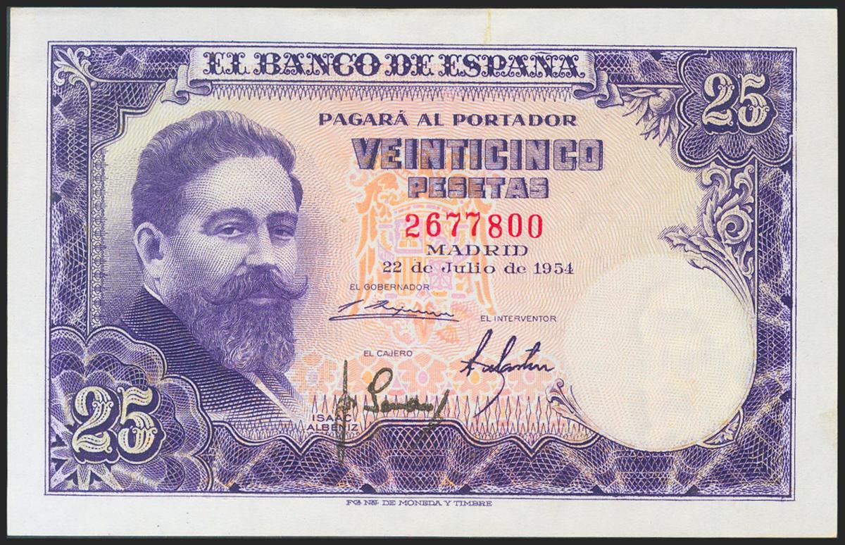 25 Pesetas. July 22, 1954. Without series. (Edifil 2021: 467). It retains much of the original size. Good Extremely Fine.