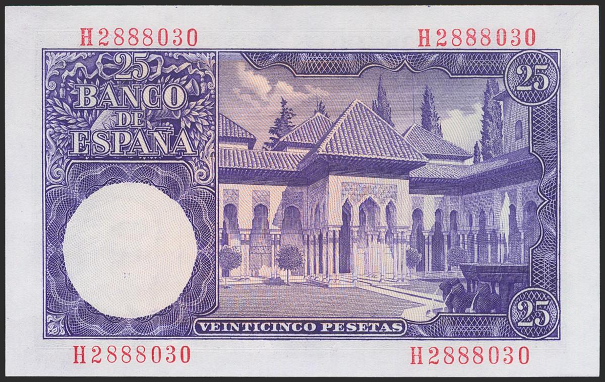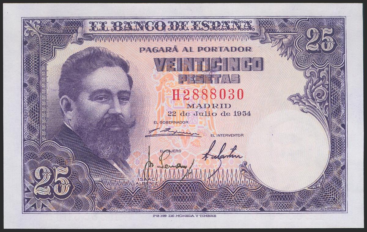 25 Pesetas. July 22, 1954. Series H. (Edifil 2021: 467a). Original sizing. Uncirculated.