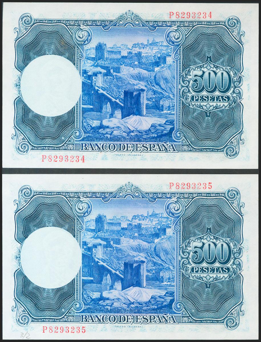 500 pesetas. July 22, 1954. Correlative couple. Series P. (Edifil 2021: 468b). It keeps all its original size. Almost Uncirculated.