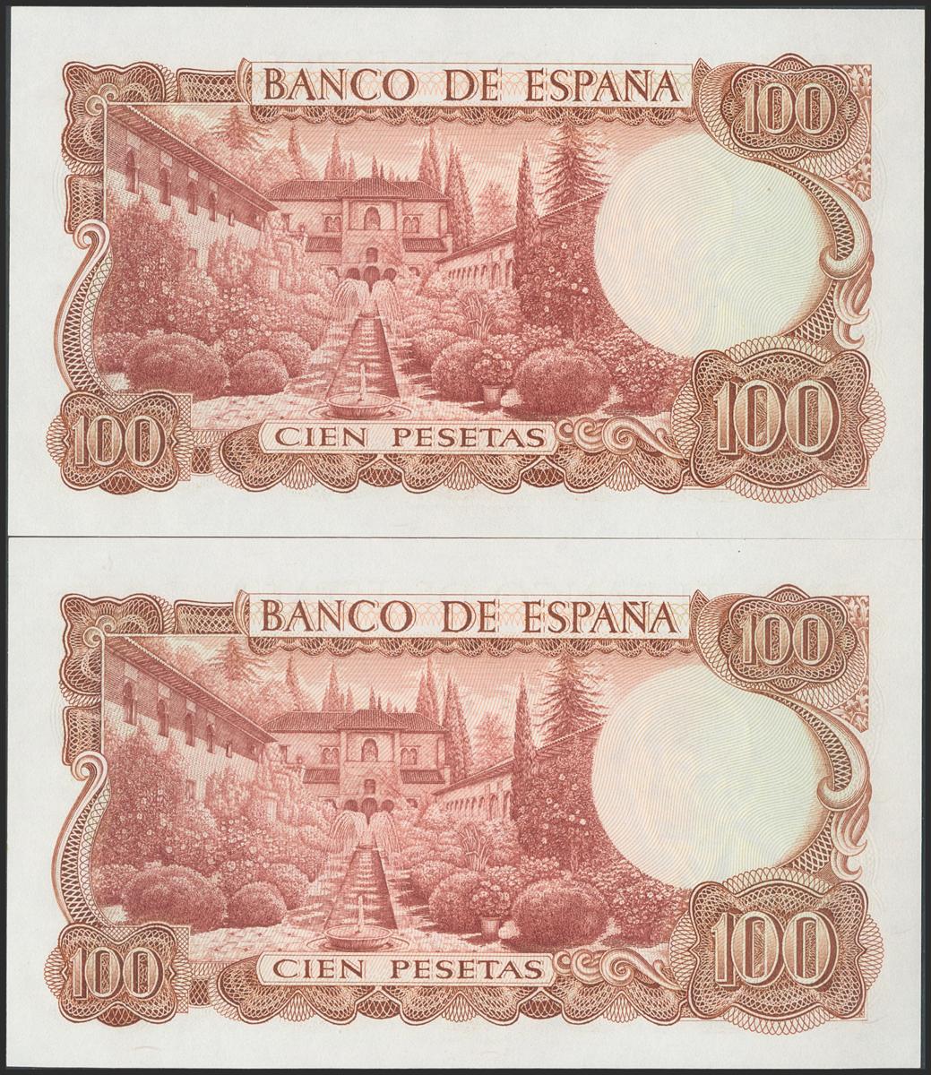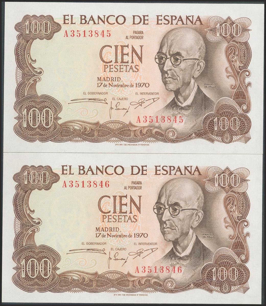 100 pesetas. November 17, 1970. Correlative pair. Series A. (Edifil 2017: 472a). Almost Uncirculated.