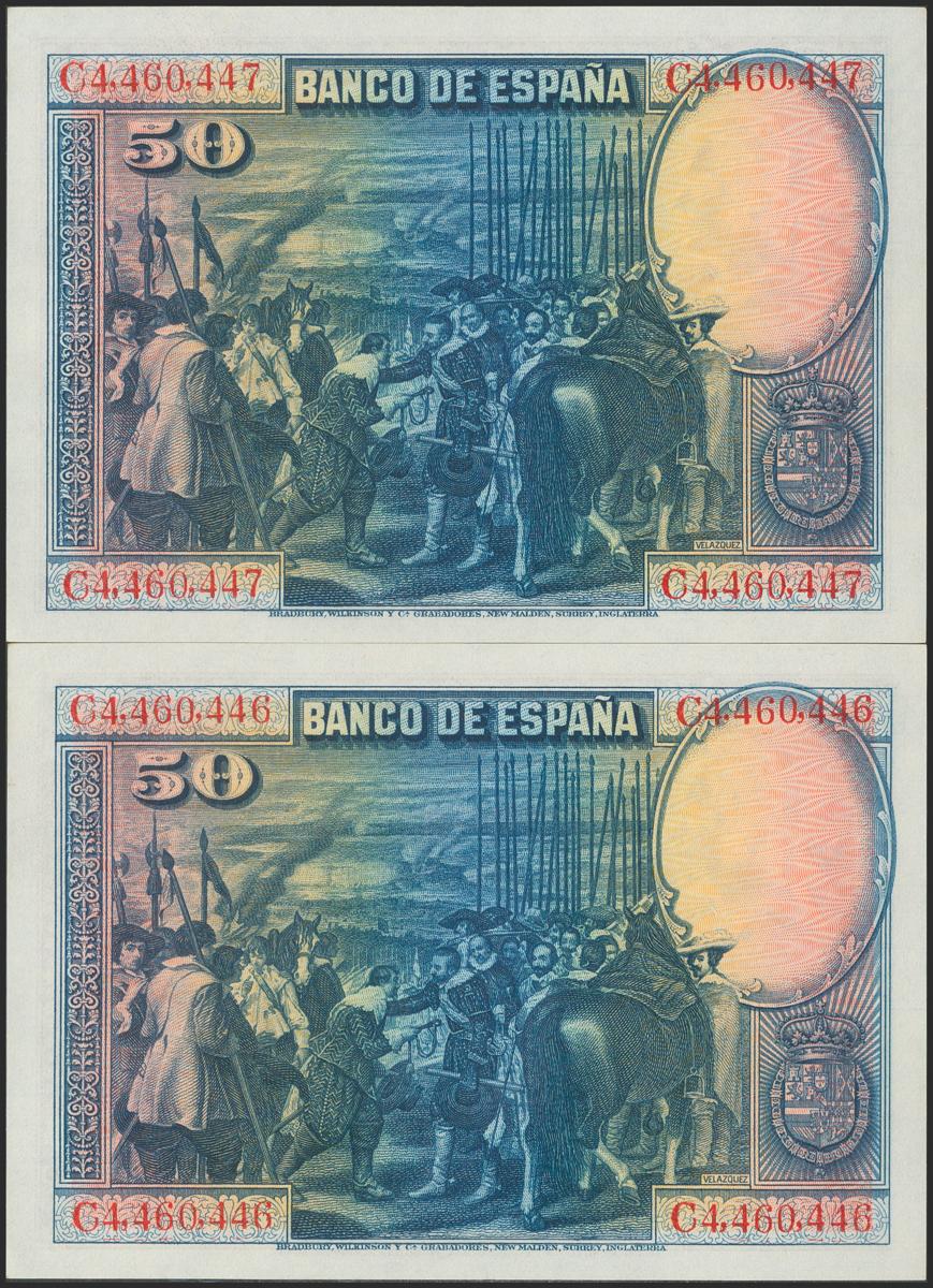 English 50 Pesetas. August 15, 1928. Correlative couple. Series C. (Edifil 2021: 354). Original sizing. Almost Uncirculated.