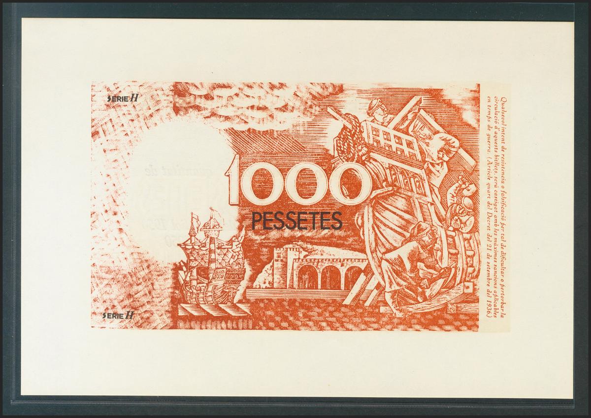 Brown proof of a Not Issued banknote of the Generalitat de Catalunya of 1000 Pesetas, issued on August 10, 1950, with the series H. (privately issued banknote, without legal endorsement)