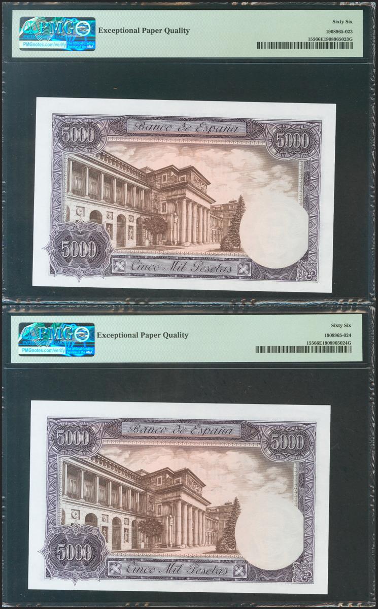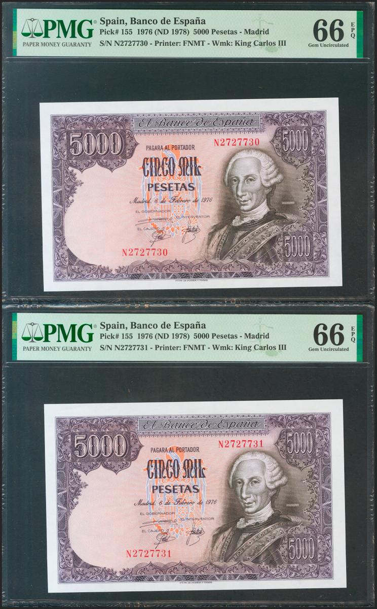 5000 pesetas. February 6, 1976. Correlative pair. Series N. (Edifil 2021: 475a, Pick: 155). Very rare in this quality, original sizing. Uncirculated. PMG66EPQ package, both.