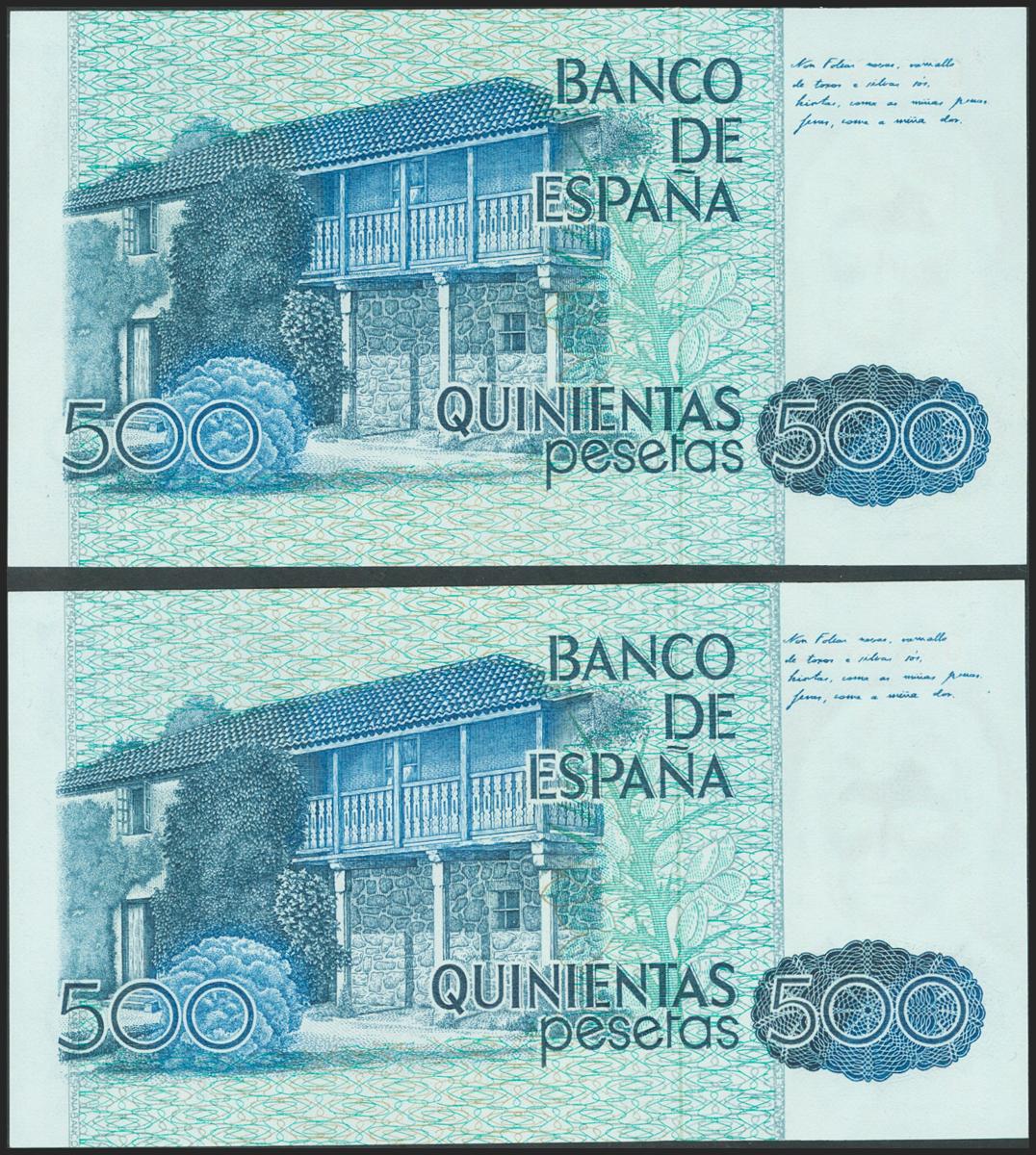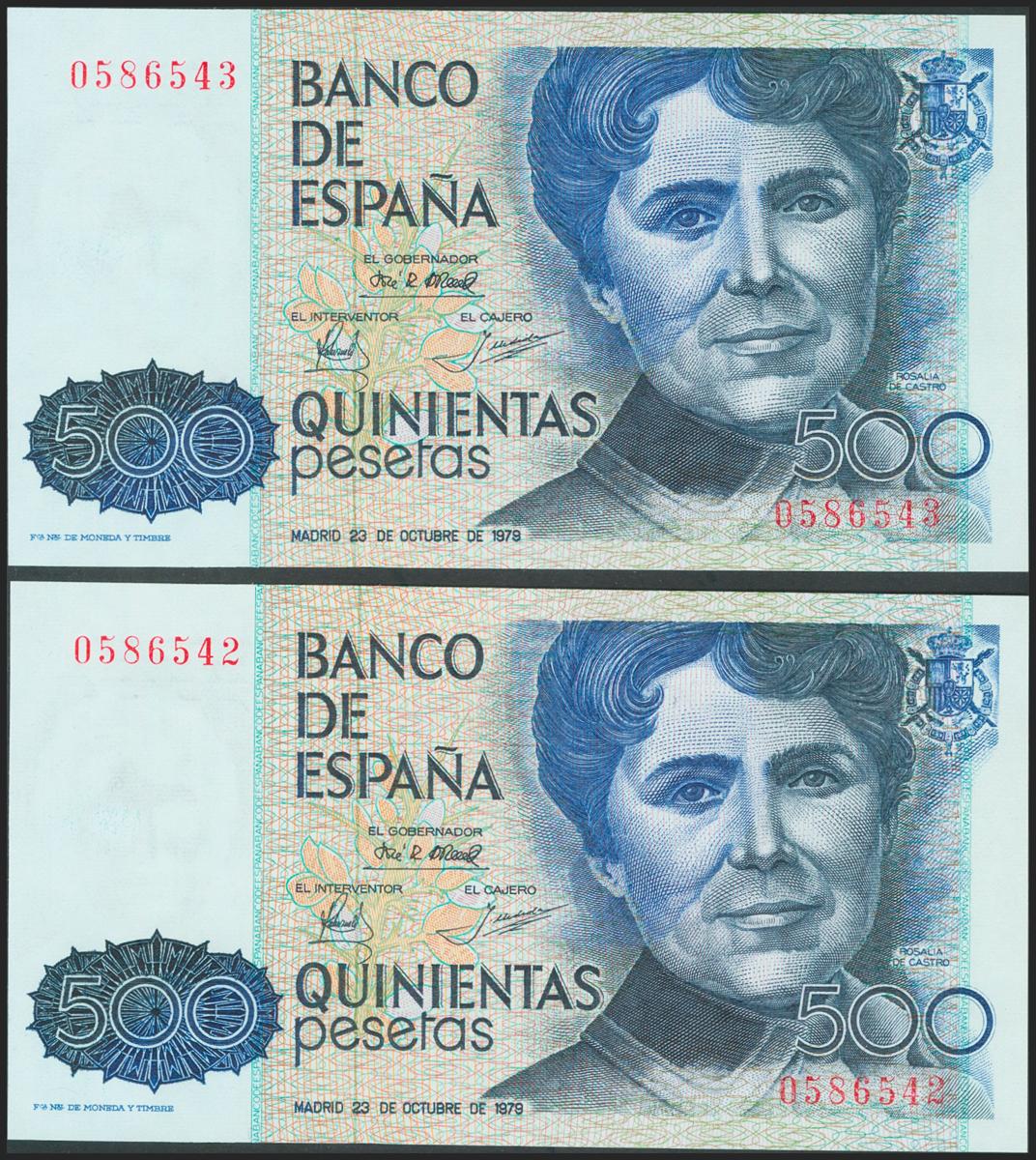 500 pesetas. October 23, 1979. Correlative couple. No series and low numbering. (Edifil 2021: 476). Uncirculated.