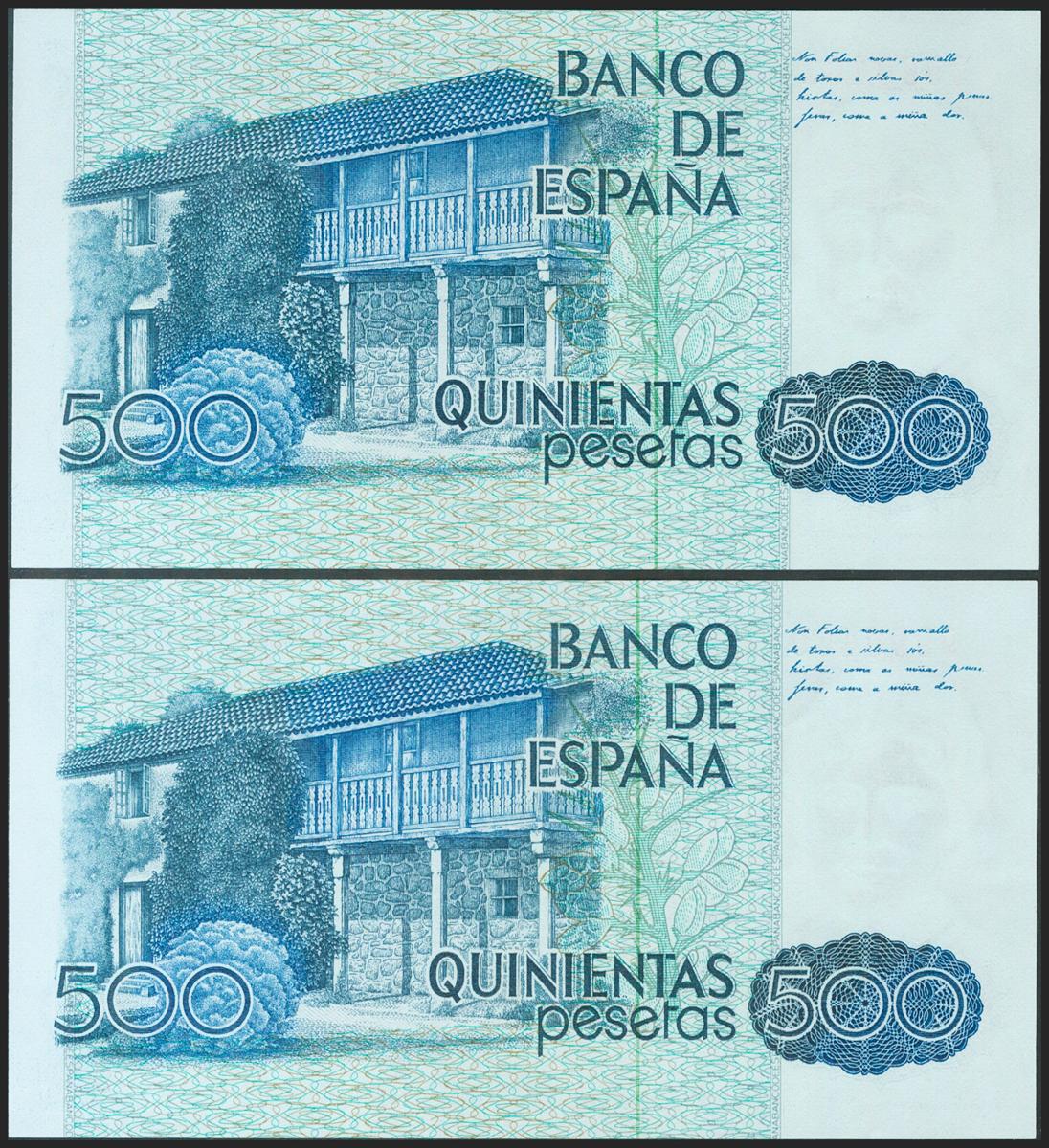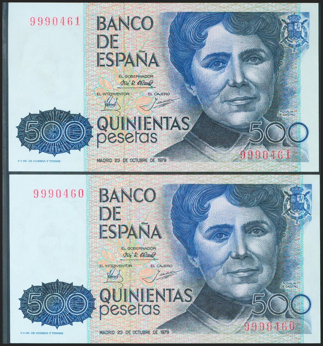 500 pesetas. October 23, 1979. Correlative couple. No serie. (Edifil 2021: 476). Almost Uncirculated.