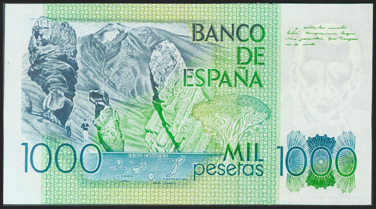 1000 Pesetas. October 23, 1979. Without series and solid numbering. (Edifil 2021: 477). Extremely rare, only nine bills like that. EBC ++.
