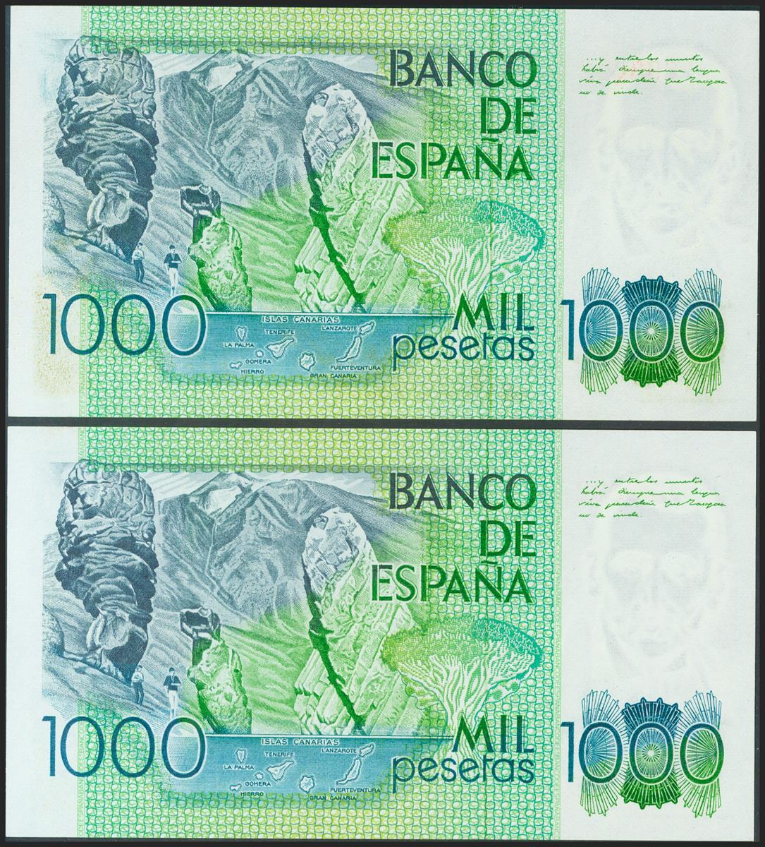 English 1000 Pesetas. October 23, 1979. Correlative couple. No series and very low numbering. (Edifil 2021: 477). Uncirculated.