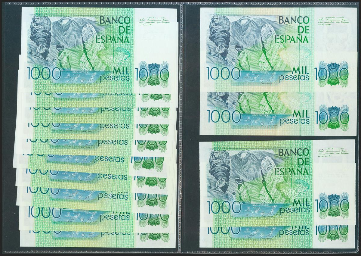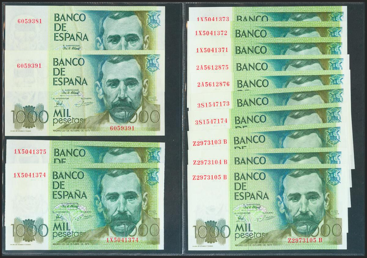 Set of 14 banknotes of 1000 Pesetas issued on October 23, 1979, without series (2) and with series 1X (5, correlative), 2A (correlative pair), 3S (correlative pair) and ZB (3, correlative). (Edifil 2021: 477, 477a). Uncirculated (except for the pair without series which is Good Extremely Fine).