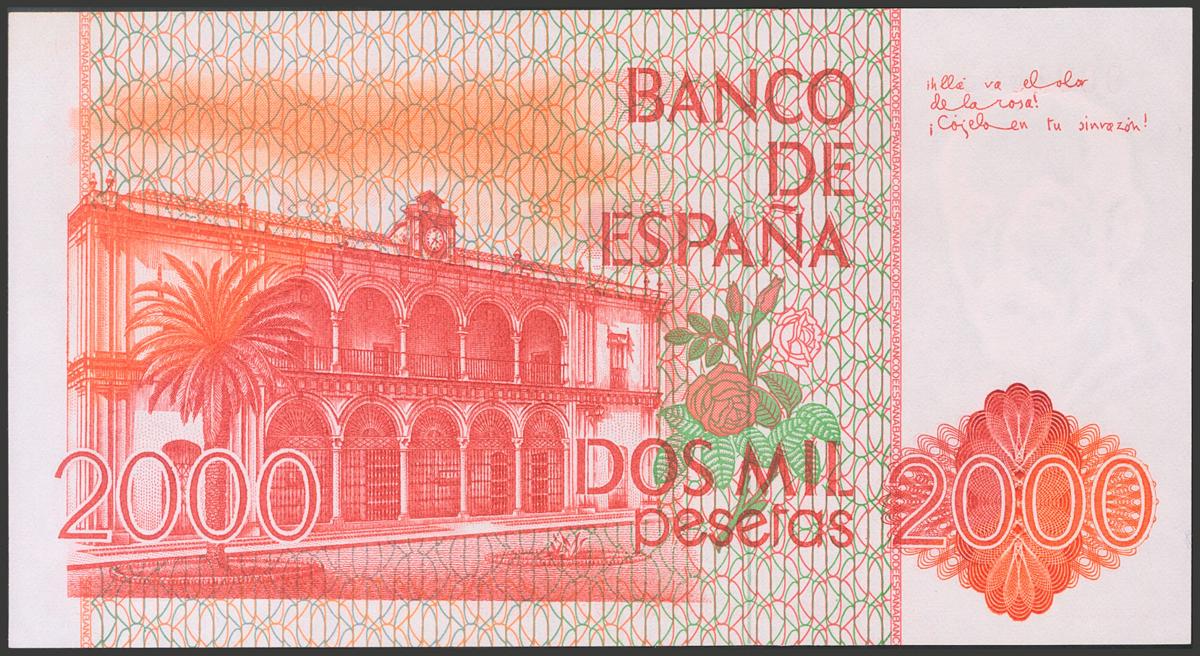 2000 pesetas. July 22, 1980. No series and very low numbering. (Edifil 2017: 479). Almost Uncirculated.