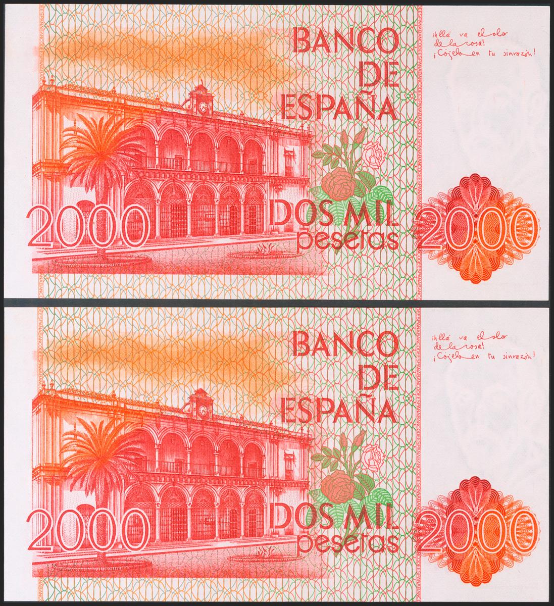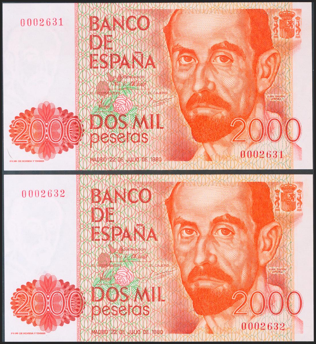English 2000 pesetas. July 22, 1980. Correlative couple. No series and very low numbering. (Edifil 2021: 479). Uncirculated.