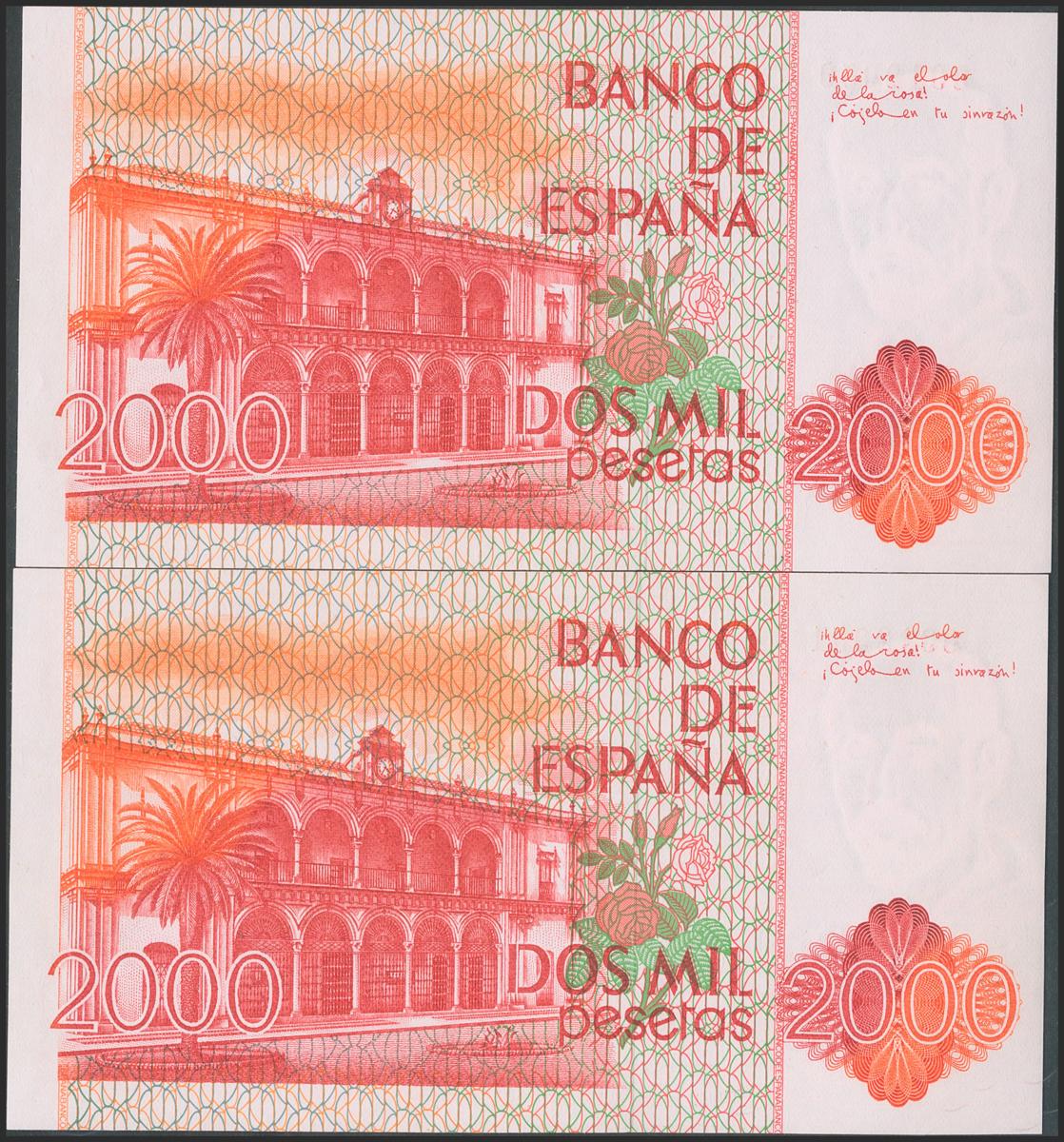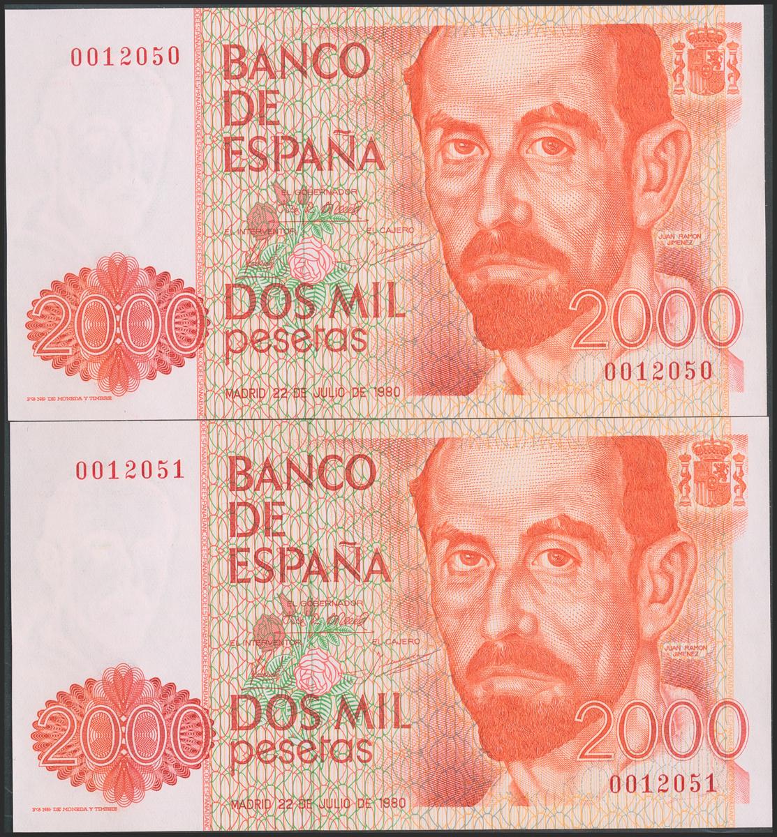 English 2000 pesetas. July 22, 1980. Correlative couple. No series and very low numbering. (Edifil 2017: 479). Uncirculated.