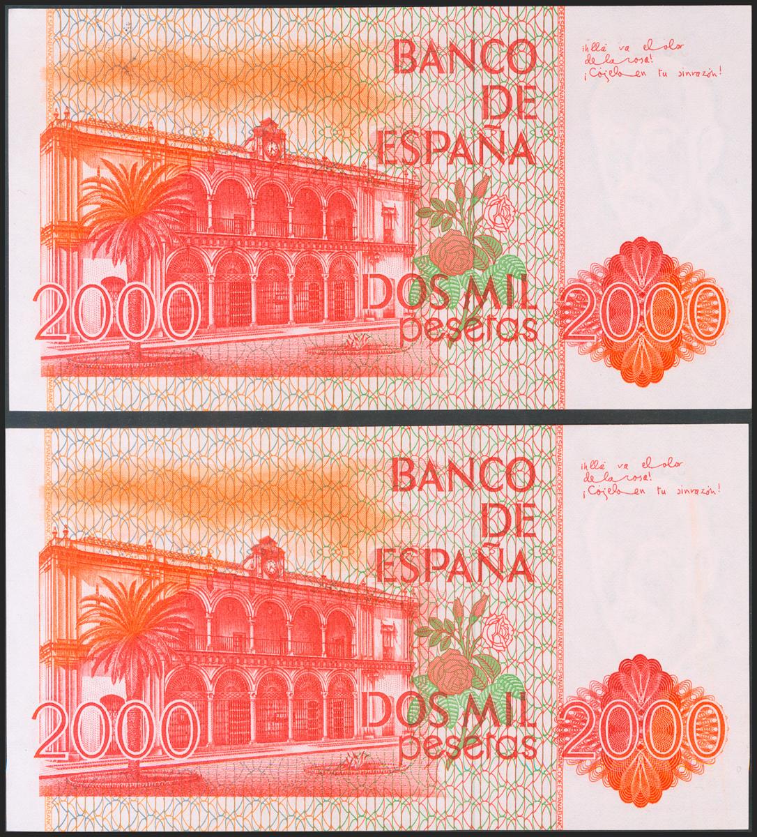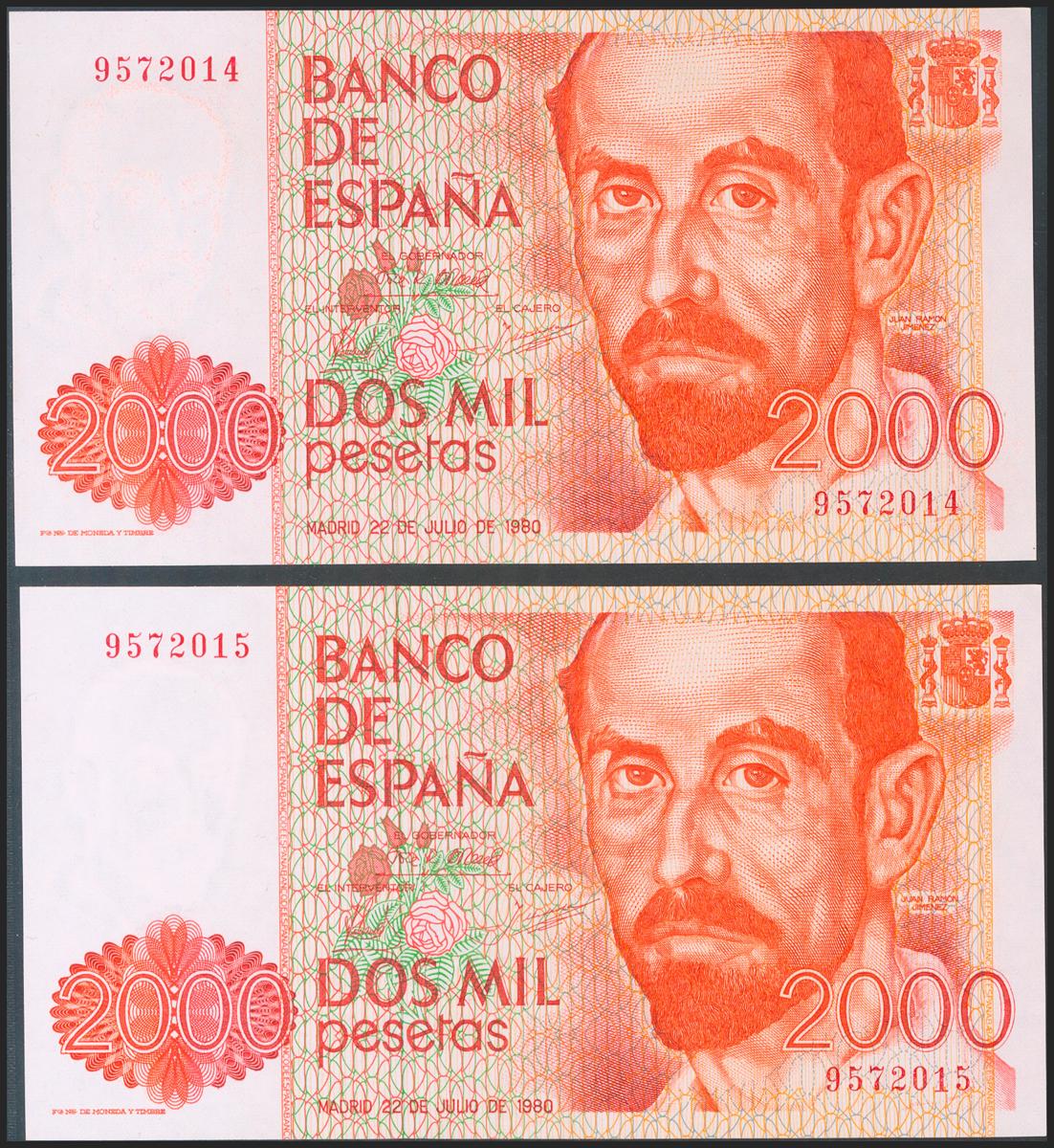 2000 pesetas. July 22, 1980. Correlative couple. No serie. (Edifil 2021: 479). Uncirculated.