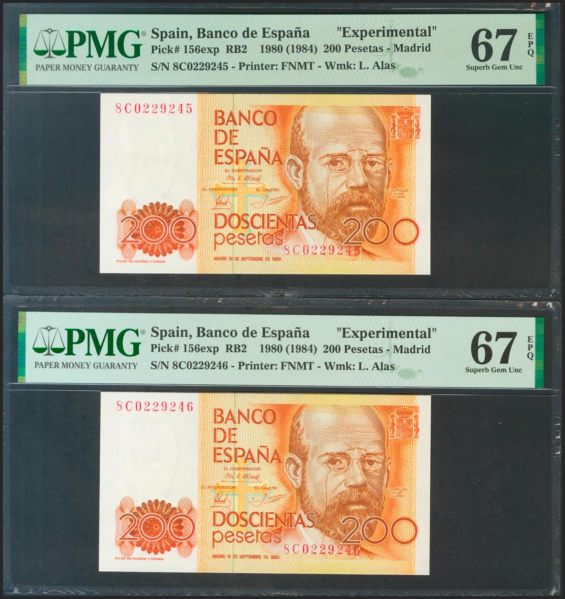 200 pesetas. September 16, 1980. Correlative pair. 8C special series. (Edifil 2021: 480c, Pick: 156exp). Rare in this exceptional quality, original size. Uncirculated. PMG67EPQ package, both.