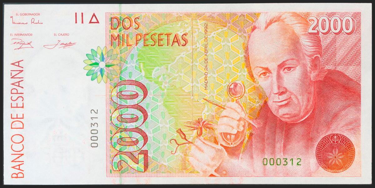 2000 pesetas. April 24, 1992. No series and very low numbering. (Edifil 2021: 482). Uncirculated.