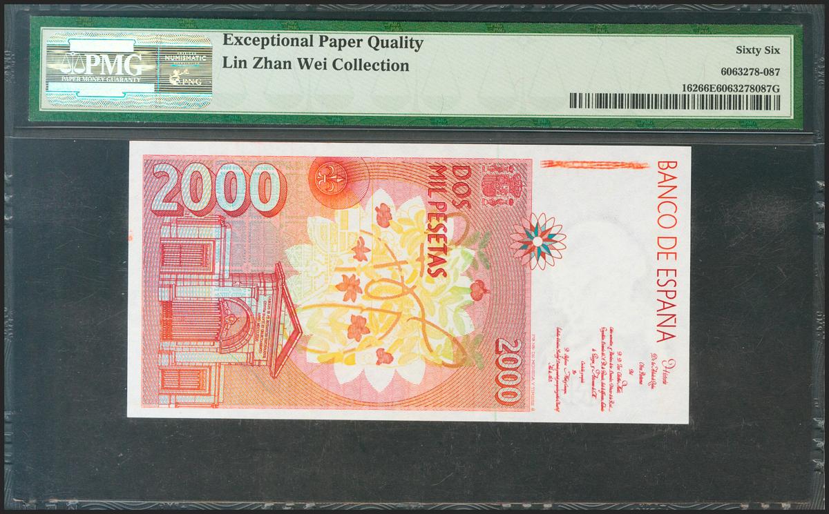 2000 pesetas. April 24, 1992. Series F. (Edifil 2021: 482a, Pick: 162). Original sizing. Uncirculated. Package PMG66EPQ.