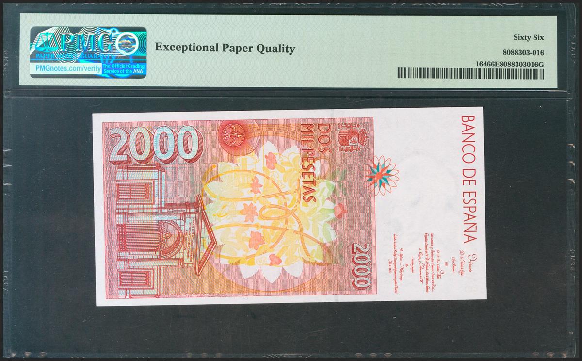 2000 pesetas. April 24, 1992. Series 5N. (Edifil 2021: 482Aa). Original sizing. Uncirculated. Package PMG66EPQ.