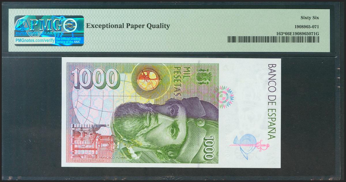 English 1000 Pesetas. October 12, 1992. Special Series 9B. (Edifil 2021: 483c, Pick: 163 *). Very rare in this exceptional quality, original sizing. Uncirculated. Package PMG66EPQ.