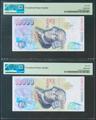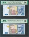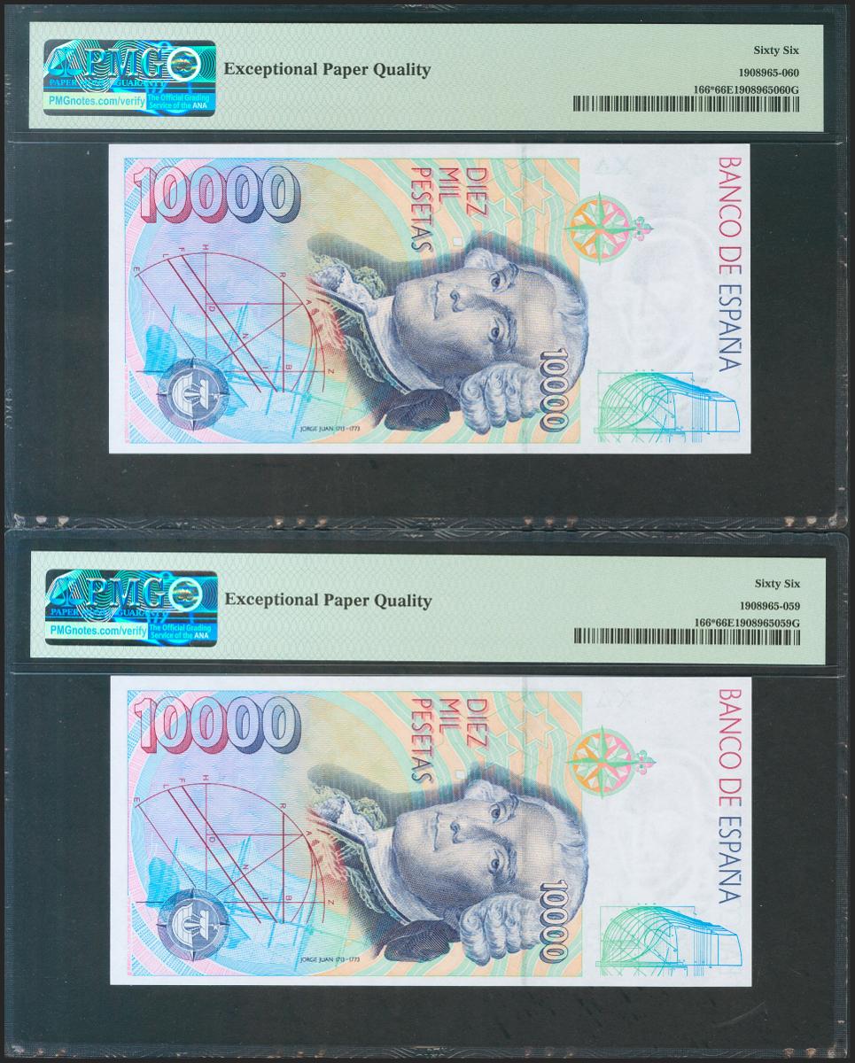 10000 Pesetas. October 12, 1992. Correlative pair. Special series 9A. (Edifil 2021: 485b, Pick: 166 *). Rare in this exceptional quality, original size. Uncirculated. PMG66EPQ package, both.