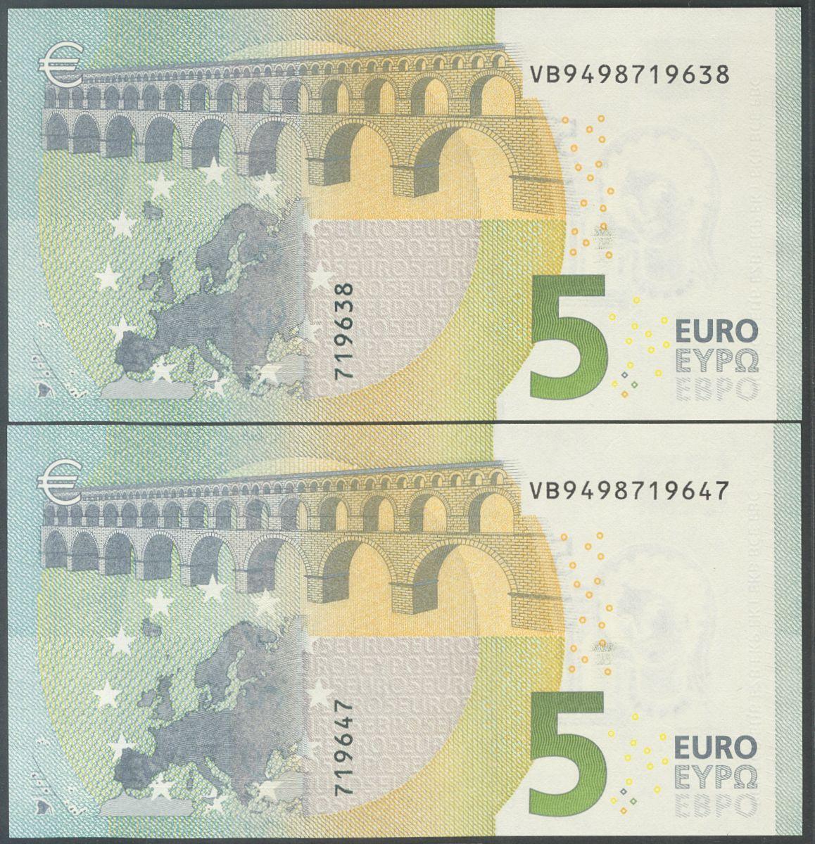 5 euros. May 2, 2013. Correlative pair (it should be remembered that the last digit of the numbering of all banknotes denominated in euros is for the internal control of the European Central Bank, the one that marks the correlation of the banknotes is the penultimate digit). Draghi signature. Series V (Spain). (Edifil 2021: 493). Uncirculated.