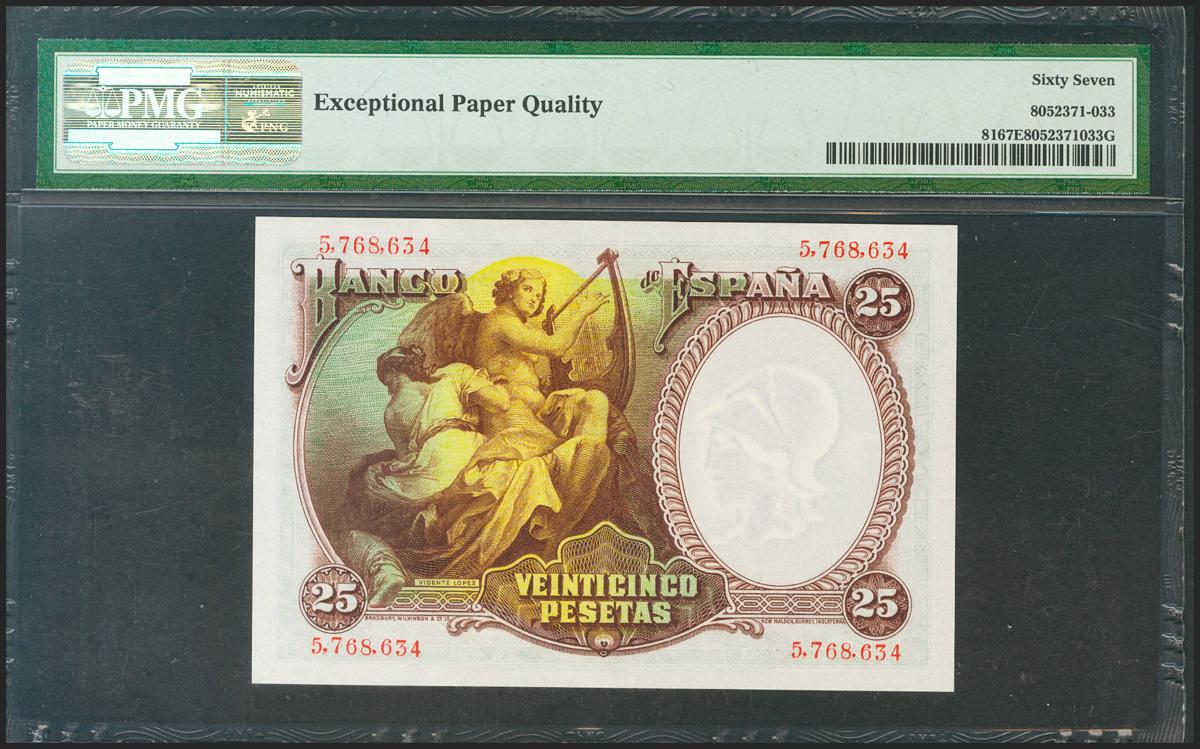 25 Pesetas. April 25, 1931. (Edifil 2021: 358). Original sizing. Rare in this exceptional quality. Uncirculated. PMG67EPQ package.