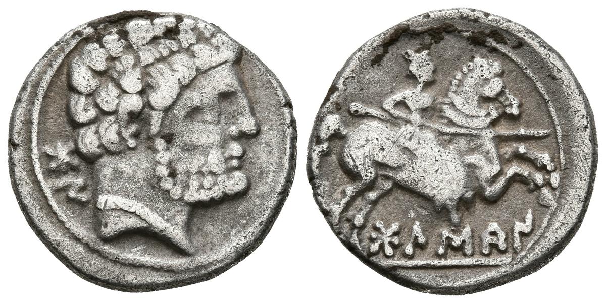 BOLSCAN (Huesca, Aragon). Denarius. (Ar. 3.86g / 18mm). 120-20 BC (FAB-1911). Anv: Bearded head to the right, behind Iberian letters BoN. Rev: Rider with spear to the right, below Iberian legend: BoLSCaN. Very Fine.