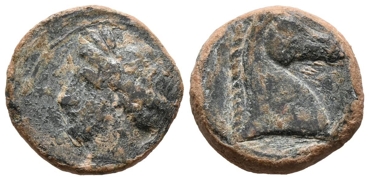 CARTAGONOVA (Cartagena, Murcia). Tracing. (Ae. 5.07g / 19mm). 220-215 BC (FAB-510). Anv: Tanit's head to the left. Rev: Horse head to right. Very Fine/ Good Very Fine.