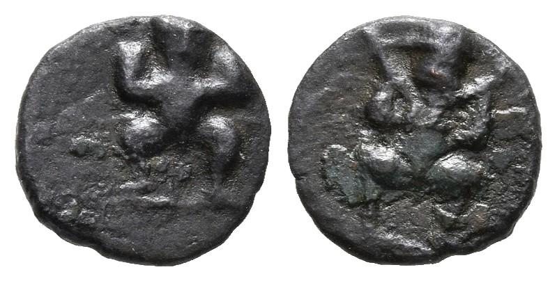 English EBUSUS (Ibiza). 1/4 Tracing. (Ae. 1.47g / 12mm). 200-100 BC (FAB-924). Anv: Bes with front skirt holding hammer and snake. Rev: Bull charging to the right. Very Fine.