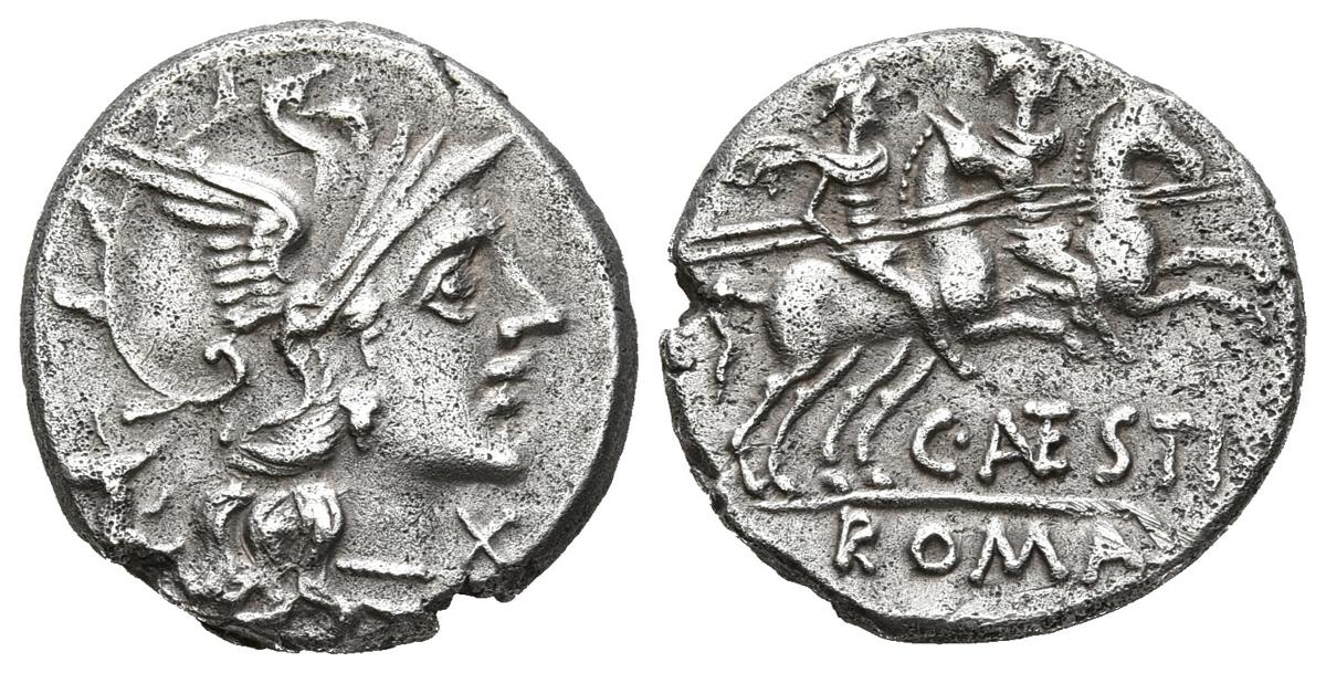 English GENS ANTESTY. Denarius. (Ar. 3.63g / 17mm). 146 BC Rome. (FFC 145; Crawford 219 / 1a). Anv: Head of Rome to the right, in front of X, behind dog. Rev: The Dioscuri on horseback to the right, above stars, below legend: C ANTESTI, in exergue: ROMA. Very Fine.