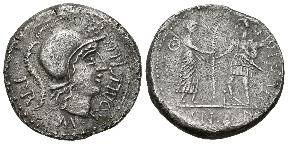 POMPEY, the Great. Denarius. (Ar. 4.70g / 19mm). 46-45 BC Hispania. (FFC 1; Crawford 469a). Anv: Head of Palas on the right, around the legend: M POBLICI LEG PRO PR, all within a dotted line. Rev: Cnaeus Pompeius son standing to the left, with one foot on the bow of the ship, delivering a palm to the Betic standing to the right with shield and two javelins, around legend: CN MAGNVS IMP. Very Fine.