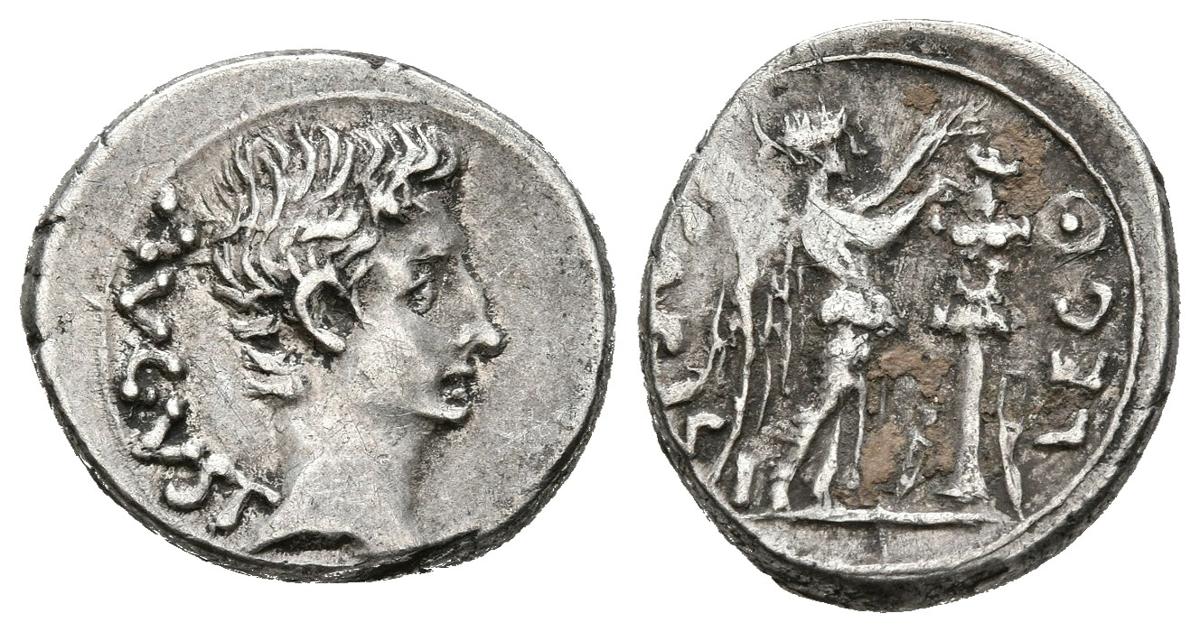 English AUGUSTUS. Quinary. (Ar. 1.86g / 14mm). 25-23 BC Emeritus Augusta. (RIC 1a). Anv: Head of Augustus on the left, behind legend: AVGVSTVS. Rev: Victoria standing to right crowning trophy, around legend: P CARISI LEG. Extremely Fine/ Almost Extremely Fine. Beautiful specimen.
