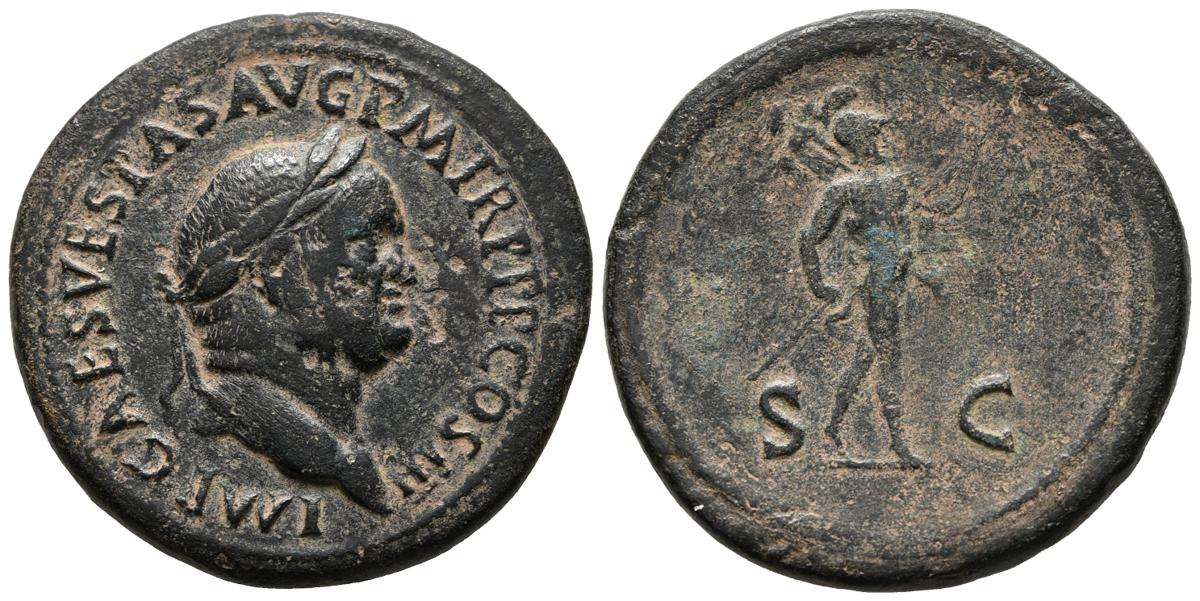 VESPASIAN. Sesterce. (Ae. 24.21g / 35mm). 71 AD Rome. (RIC 247). Anv: Laureate head of Vespasian on the right, around legend: IMP CAES VESPAS AVG PM TR PPP COS III. Rev: Mars advancing to the right carrying trophy and spear, between Uncirculated. Very Fine.