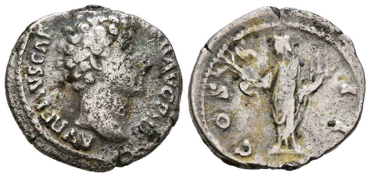 MARCUS AURELIUS. Denarius. (Ar. 2.71g / 18mm). 145-147 AD Rome. (RIC 429a). Anv: Head of Marcus Aurelius to the right, around legend: AVRELIVS CAESAR AVG P II F. Rev: Honos standing to the left carrying branch and cornucopia, around legend: COS II. Almost Very Fine.