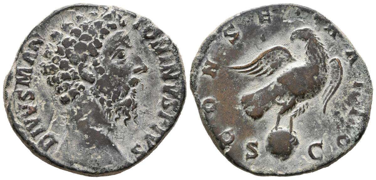 DIVO MARCUS AURELIUS. Sesterce. (Ae. 21.13g / 30mm). 180 AD Rome. (RIC 654). Anv: Head of Marcus Aurelius to the right. Rev: Eagle on globe looking left, between Uncirculated, around legend: CONSECRATIO. Almost Very Fine. Very rare.