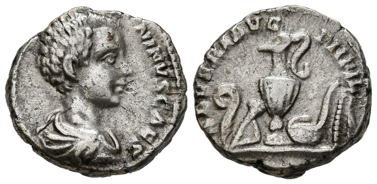English CARACALLA. Denarius. (Ar. 3.90g / 17mm). 196-198 AD Rome. (RIC 4). Anv: Draped bust of Caracalla on the right, around legend: M AVR ANTONINVS CAES. Rev: Religious elements: Knife, scepter, jug, litho and symbol, around legend: SEVERI AVG PII FIL. Very Fine.