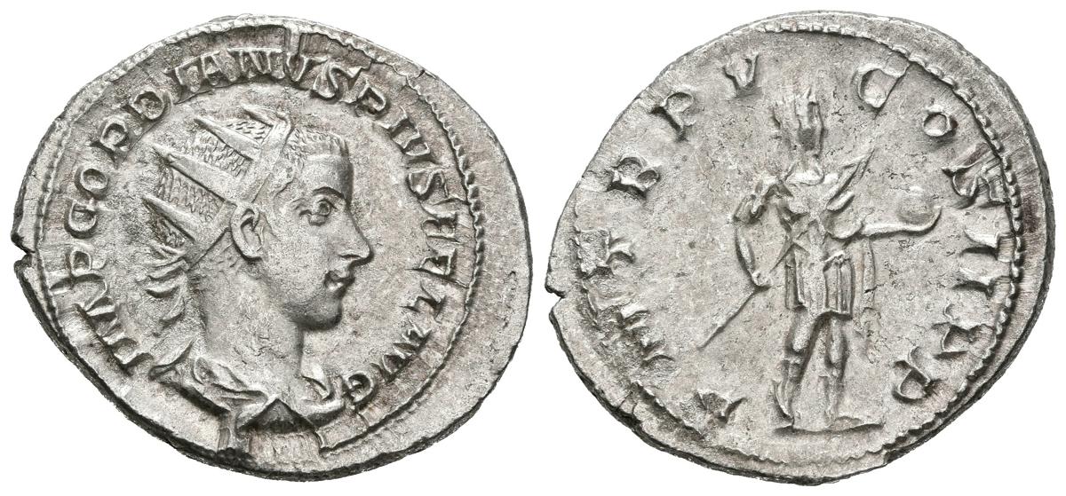 GORDIAN III. Antoninian. (Ar. 4.50g / 24mm). 241-243 AD Rome. (RIC 93). Anv: Radiated and draped bust of Gordiano III on the right, around legend: IMP GORDIANVS PIVS FEL AVG. Rev: Gordiano III on the right carrying spear and balloon, around legend: PM TR PV COS II P P. Very Fine.