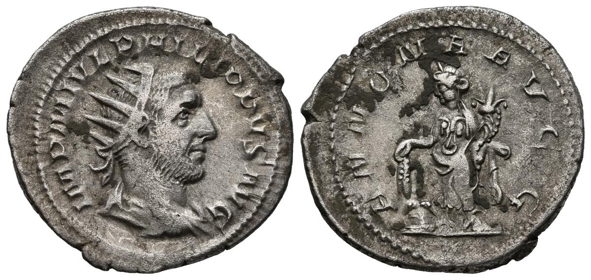 English FILIPO I. Antoniniano. (Ar. 4.06g / 25mm). 247 AD Rome. (ICR 28c). Anv: Radiated and draped bust of Philip I on the right, around legend: IMP M IVL PHILIPPVS AVG. Rev: Annona standing on left carrying herringbone on modio and cornucopia, around legend: ANNONA AVG. Very Fine.