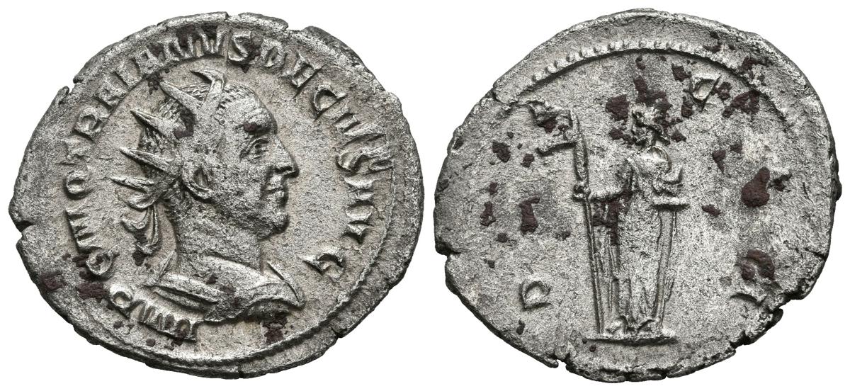 TRAJAN DECIUS. Antoninian. (Ar. 3.37g / 24mm). 250-251 AD Rome. (ICR 12b). Anv: Radiated and draped bust of Trajan Decius on the right, around legend: IMP CMQ TRAIANVS DECIVS AVG. Rev: Dacia standing standing on the left carrying a scepter with a wolf's head (Draco) at the end, around the legend: DACIA. Very Fine.