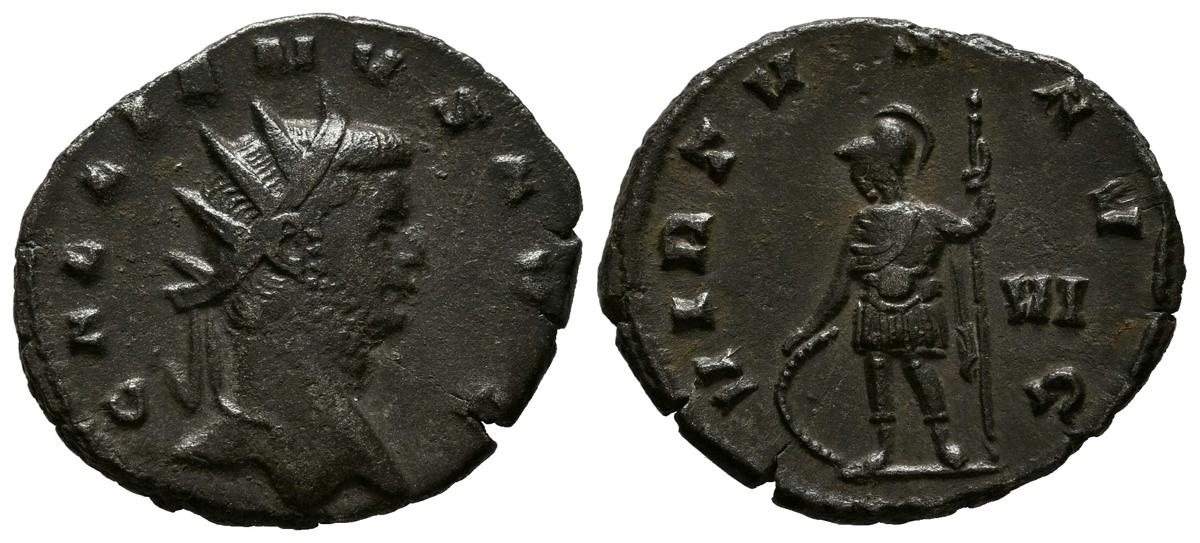 GALLIENUS. Antoninian. (Ae. 3.24g / 20mm). 260-262 AD Rome. (RIC 325). Anv: Radiated head of Galieno to the right, around legend: GALLIENVS AVG. Rev: Virtus left standing carrying spear and shield, in field VI, around legend: VIRTVS AVG. Very Fine/ Good Very Fine.