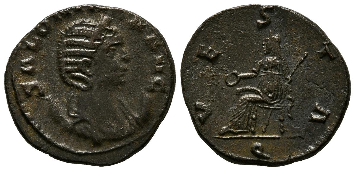 SALONINA. Antoninian. (Ae. 3.35g / 20mm). 260-261 AD Rome. (RIC 32). Anv: Diademic and draped bust on the crescent of Salonina on the right, around legend: SALONINA AVG. Rev: Vesta seated to the left carrying patera and scepter, in exergue: Q, around legend: VESTA. Very Fine.