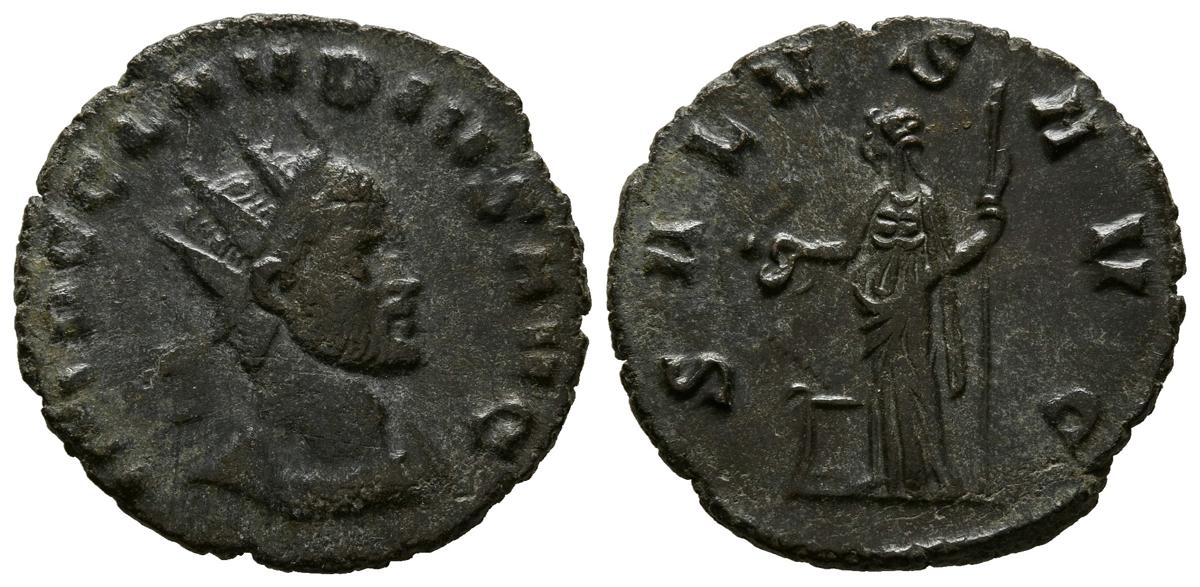 CLAUDIUS II. Antoninian. (Ae. 3.13g / 20mm). 268-270 AD Antioch. (RIC 98). Anv: Bust radiated and with cuirass of Claudius II, around legend: IMP CLAVDIVS AVG. Rev: Salus left standing holding scepter and feeding a patera snake, around legend: SALVS AVG. Very Fine.