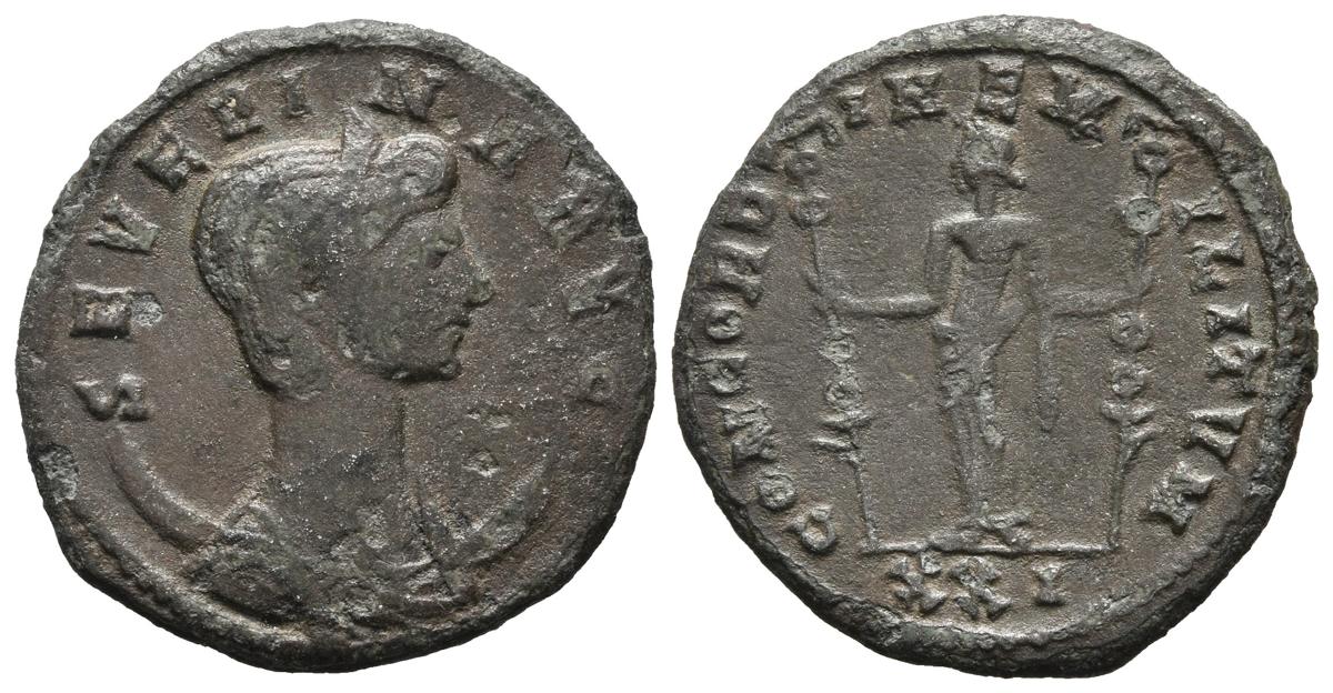 English SEVERINA. Antoninian. (Ae. 2.31g / 22mm). 274-275 AD Tícino. (RIC 8). Ob: diademic and draped bust of Severina to the right on crescent, around legend: SEVERINA AVG. Rev: Concordia left standing carrying two banners, below: XXI, around legend: CONCORDIAE MILITVM. Very Fine.