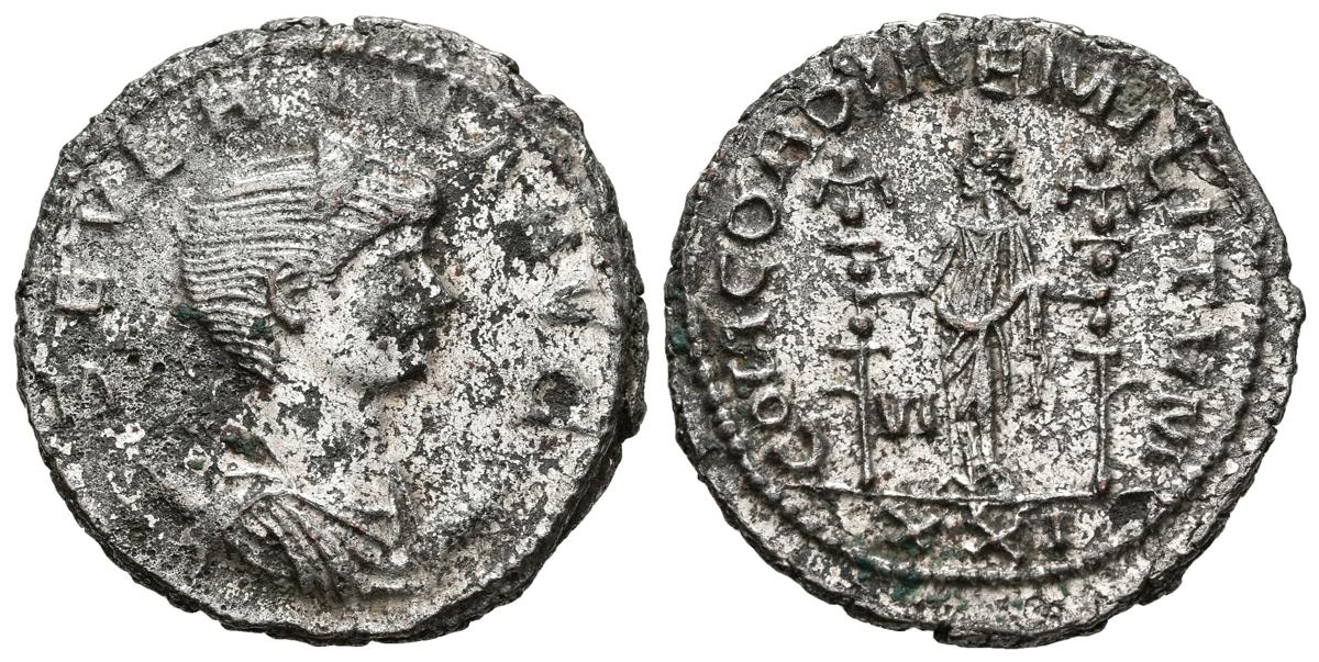 SEVERINA. Antoninian. (See 4.59g / 23mm). 275 AD Rome. (RIC 20). Ob: diademic and draped bust of Severina to the right on crescent, around legend: SEVERINA AVG. Rev: Concordia standing on the left between two banners, in field VI, in exergue: XXI, around legend: CONCORDIAE MILITVM. Good Very Fine. Remains of original silver.