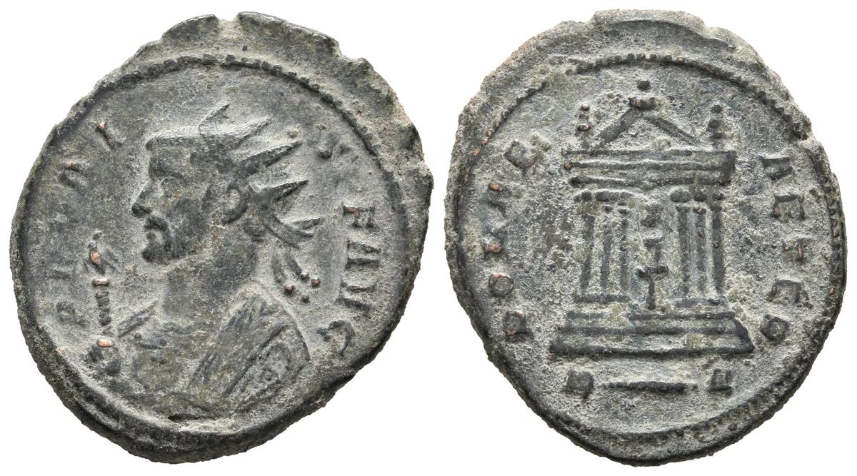 English PROBUS. Antoninian. (Ae. 4.91g / 24mm). 281 AD Rome. (RIC 183). Anv: Radiated bust with imperial mantle of Probus on the left holding scepter with an eagle, around legend: PROBVS PF AVG. Rev: Hexagon tempo with Rome inside, below: R, lightning and A, around legend: ROMAE AETER. Very Fine.