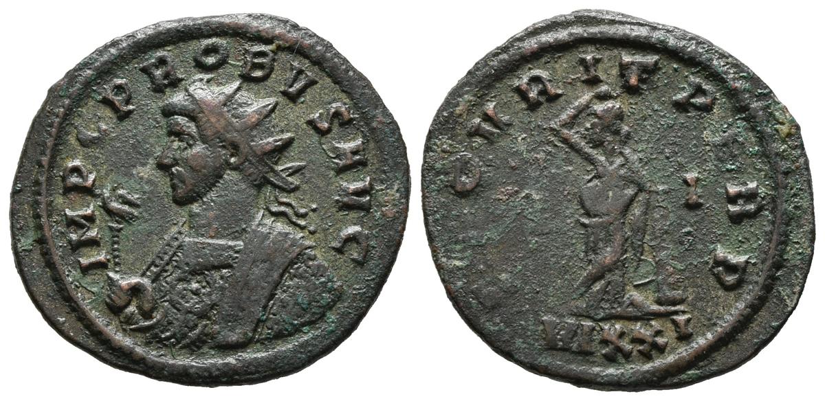English PROBUS. Antoninian. (Ae. 3.97g / 24mm). 282 AD Ticinum. (RIC 525). Anv: Bust radiated and with cuirass holding scepter with imperial eagle, around legend: IMP C PROBVS AVG. Rev: Securitas standing on the left, in exergue: VI XXI, in field: I, around legend: SECVRIT PERP. Good Very Fine/ Very Fine.
