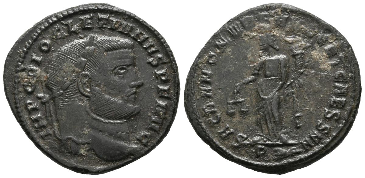DIOCLETIAN. Follis. (Ae. 7.86g / 28mm). 300-303 AD Ticinio. (RIC 45a). Anv: Laureate head of Diocletian on the right, around legend: IMP C DIOCLETIANVS PF AVG. Rev: Moneta standing to left carrying cornucopia and scales, in exergue: PT, around legend: SACRA MONET AVGG ET CAESS NOSTR. Good Very Fine/ Very Fine.